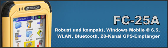 Aufgrund der offenen Informationspolitik von Topcon bezogen auf die Hardwareschnittstellen der Geräte, gibt es bereits viele Softwarefirmen, deren Felderfassungsprogramme ebenfalls auf dem FC-25A lauffähig sind und mit den Topcon- und/oder Sokkia-Geräten arbeiten können. Erkundigen Sie sich dazu bitte bei Ihrem Feldsoftwarehersteller.